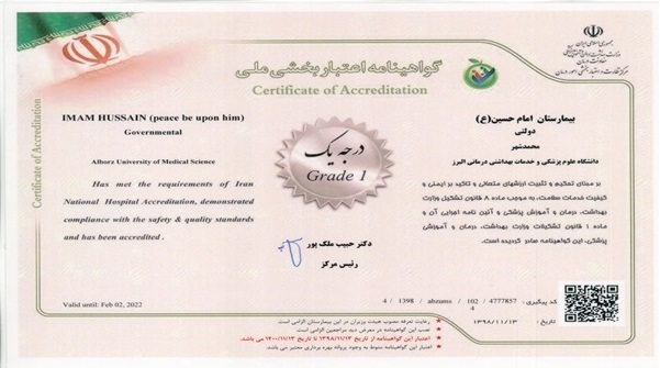 طی ارزیابی انجام شده در آبان ماه 1403 درجه اعتبار بخشی مرکز آموزشی درمانی امام حسین(ع)، یک میباشد.